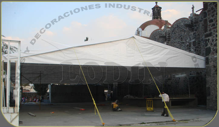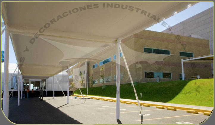 Lonas y Decoraciones Industriales, S.A de C.V. Le ofrece innovación de carpas convencionales con estructura modular desmontable, cubierta de lona a dos aguas fabricada en lona 610 con cortinas perimetrales plafón de tela que da una apariencia estética para cubrir la estructura, Anchos que manejamos: Carpa 5m., Carpa 10m., Carpa 15m., Carpa 20m., Alturas variables.